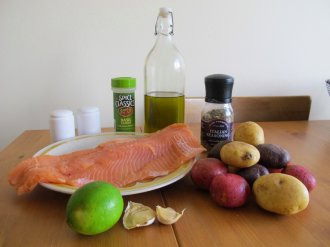 Разогрейте духовку до 200 градусов. Смажьте картошку оливковым маслом, добавьте специи и отправьте запекаться. Рыбу замаринуйте.
