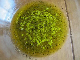 Смешайте оливковое масло, лимонный сок, специи, измельченный чеснок и мелко порезанную или сушеную зелень.