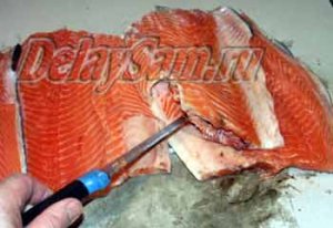 Точно такую же процедуру проделываем и с другой половиной рыбы, только уже отгибаем позвоночник с ребрами вверх, стараясь отделить их от мяса рыбы на шкуре.