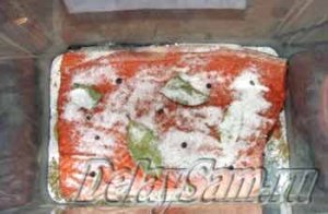 С тушки рыбы так же срезаются плавники, а сама тушка разрезается на максимально большие куски, которые только входят в вашу посуду, в которой вы будете солить свою форель. С больших кусков потом просто проще делать красивую нарезку. Куски рыбы будете срезать прямо со шкуры, положив кусок на доску.