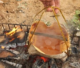 Развести на песке костер. Выпотрошить рыбу, чешую не снимать, натереть изнутри солью, положить специи. После того, как огонь хорошо раскалит песок, зарыть в него рыбу, обернутую в несколько слоев мокрой бумаги, сверху развести огонь. Блюдо будет готово через 40—50 минут. Таким же способом можно приготовить рыбу и в горячих углях костра.