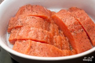 Филе лосося нарезаем порционными кусочками шириной примерно в 5-6 см. Кладем в глубокую форму для запекания. Солим, перчим, сбрызгиваем лимонным соком.